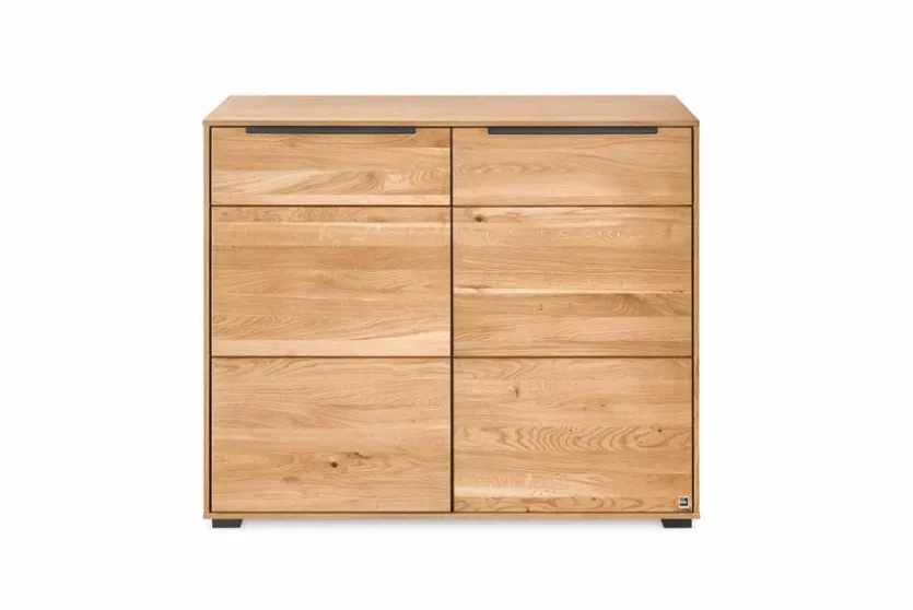 - Korpus aus Holzwerkstoff (Spanplatte) in Echtholz Eiche furniert, Front aus massiver Eiche