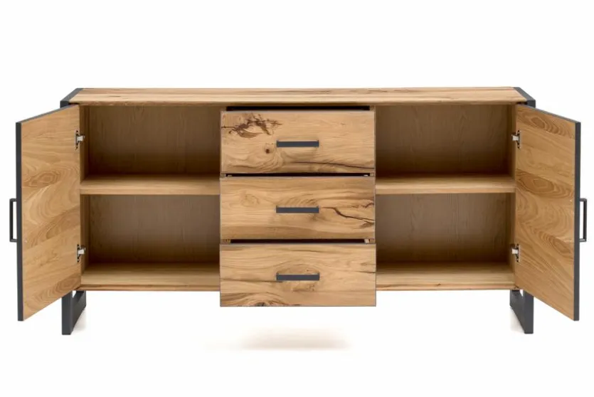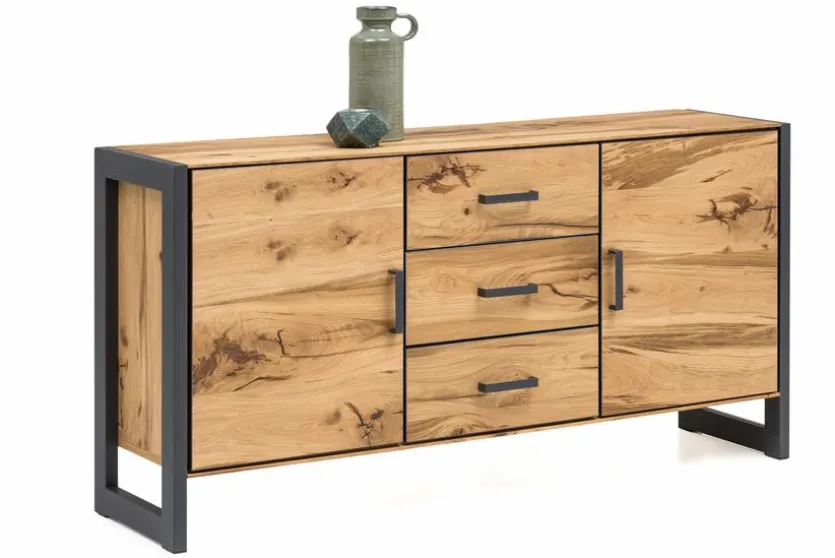 - Korpus und Front aus Balkeneiche furniert, Gestell aus Metall in graphitgrau