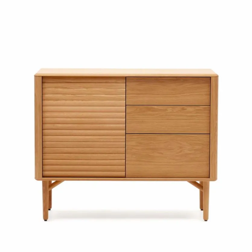 Mit dem Sideboard Lenon von Kave Home schlägt das Herz von Designliebhabern höher. Neben seiner exklusiven Form im angesagten 60er-Jahre-Style bietet die Kommode eine nahezu schnörkellose Optik, die lediglich durch das Relief an der Tür durchbrochen wird. So lässt sich das Sideboard Lenon wunderbar als attraktiver Blickfang im Wohn- oder Schlafzimmer inszenieren.