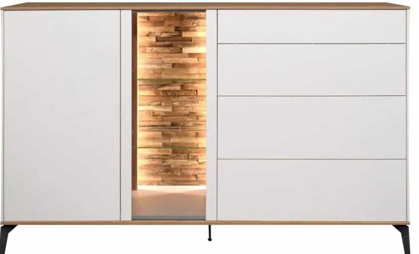 - Mit 1 Tür, 1 Glastür, 1 Klappe und 2 Schubkästen mit Selbsteinzug