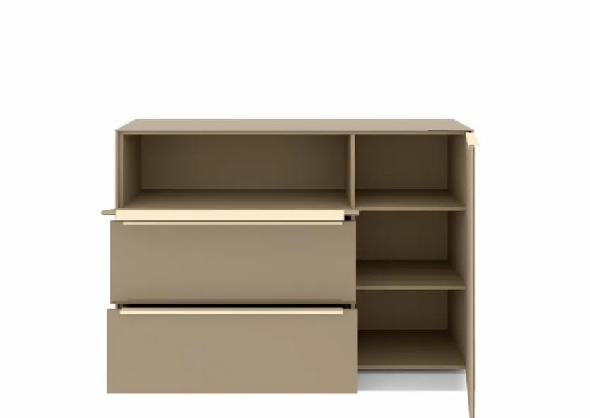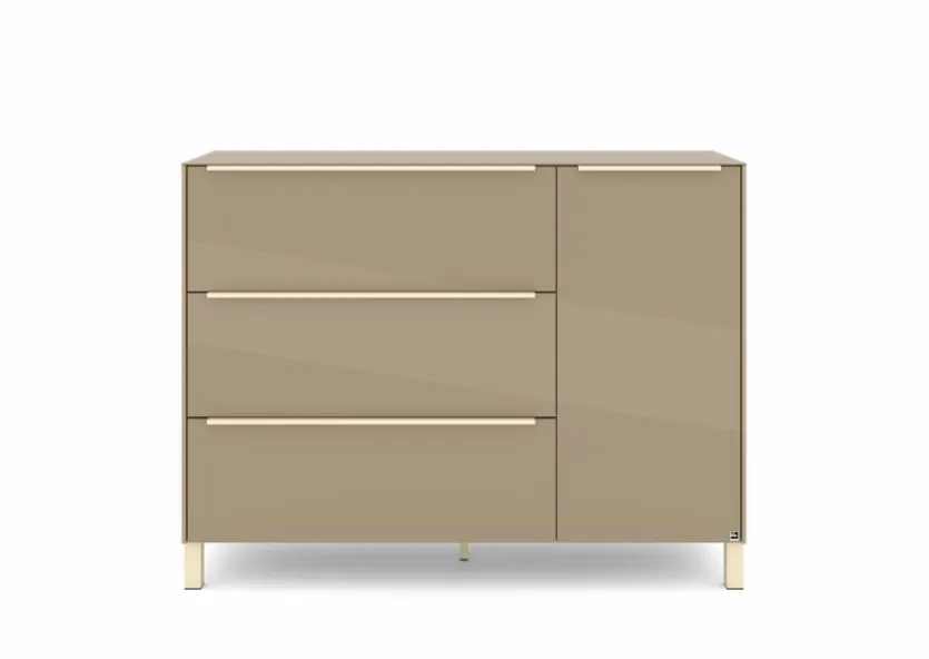 - Mit 1 Tür, 1 Klappe und 2 Schubkästen, Griffe aus Metall mit Lack in kaschmir