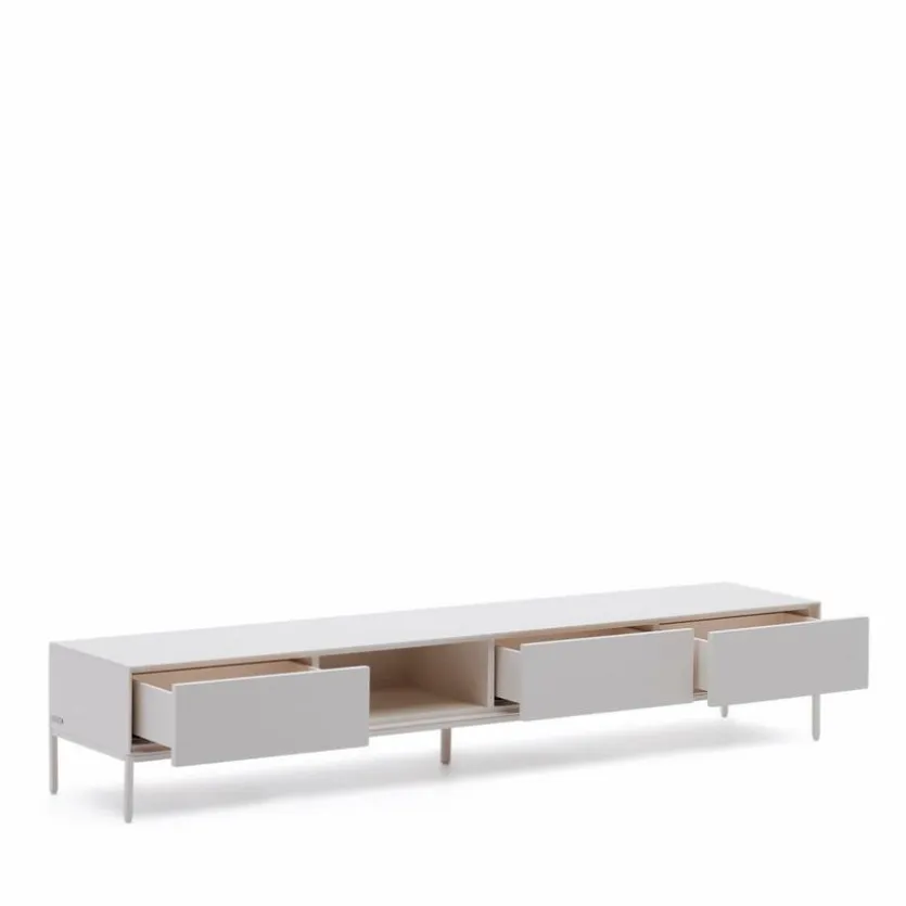 Das TV-Lowboard Vedrana von Kave Home ist eine famose Wahl für modern eingerichtete Räume. Lackierte Oberflächen bringen die schnörkellose Formgebung dieses TV-Unterschranks exzellent zur Geltung. Ein schlankes Gestell verleiht dem Möbel einen Look, der Leichtigkeit vermittelt. Ausgestattet ist das grifflos gestaltete TV-Lowboard Vedrana mit einem Push-to-open-System.