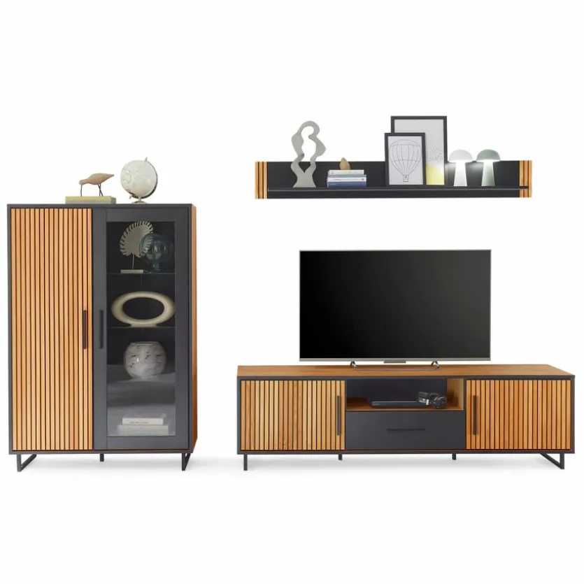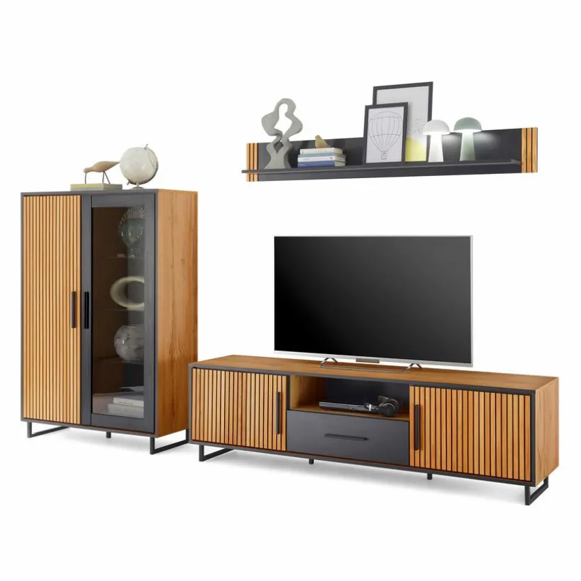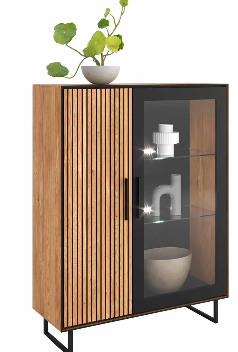 - Korpus aus Holzwerkstoff (Spanplatte) mit hochwertiger Dekorfolie in Eiche Nachbildung, Front aus massiver Eiche mit Akustikpaneel auf Spanplatte foliert, Rahmen/Absetzung aus Holzwerkstoff (Spanplatte) mit kratzfester Melaminharzfolie in Schwarz