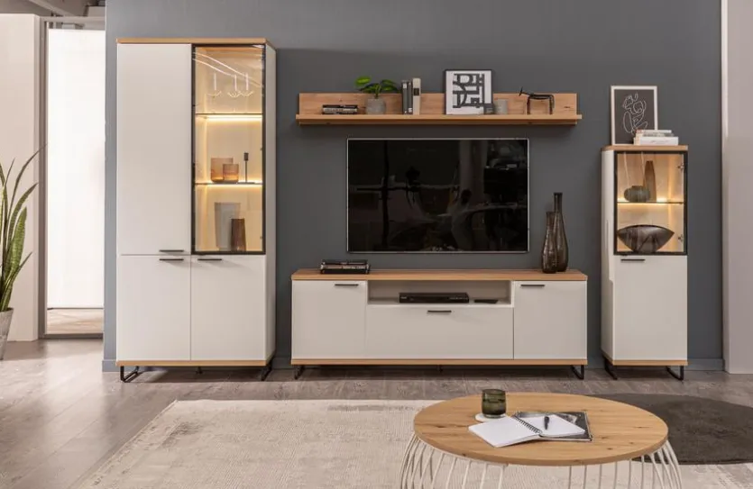 - Korpus und Front aus Holzwerkstoff (Spanplatte) mit kratzfester Melaminharzfolie in Polarweiß, Absetzung aus Holzwerkstoff (Spanplatte) mit kratzfester Melaminharzfolie in Artisan Eiche