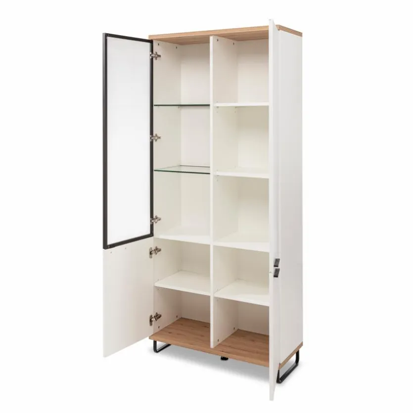- Mit 3 Türen (1 Türe mit Glas – Klarglasausfürhung aus ESG Sicherheitsglas), 2 Glasböden und 6 Holzböden