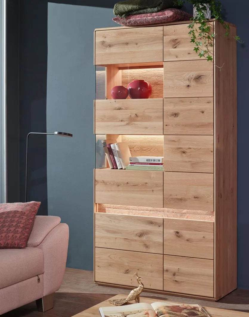 Für Massivholz – auch Vollholz – werden Querschnitte aus einem Baumstamm herausgearbeitet und durch Bohren, Fräsen oder Hobeln weiterverarbeitet. Das Material ist ein echtes Naturprodukt, das in seiner Struktur und Farbe einzigartig ist.