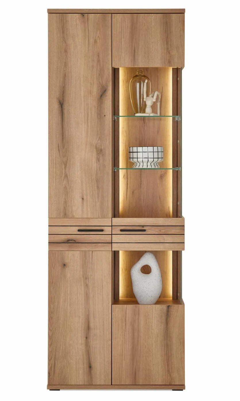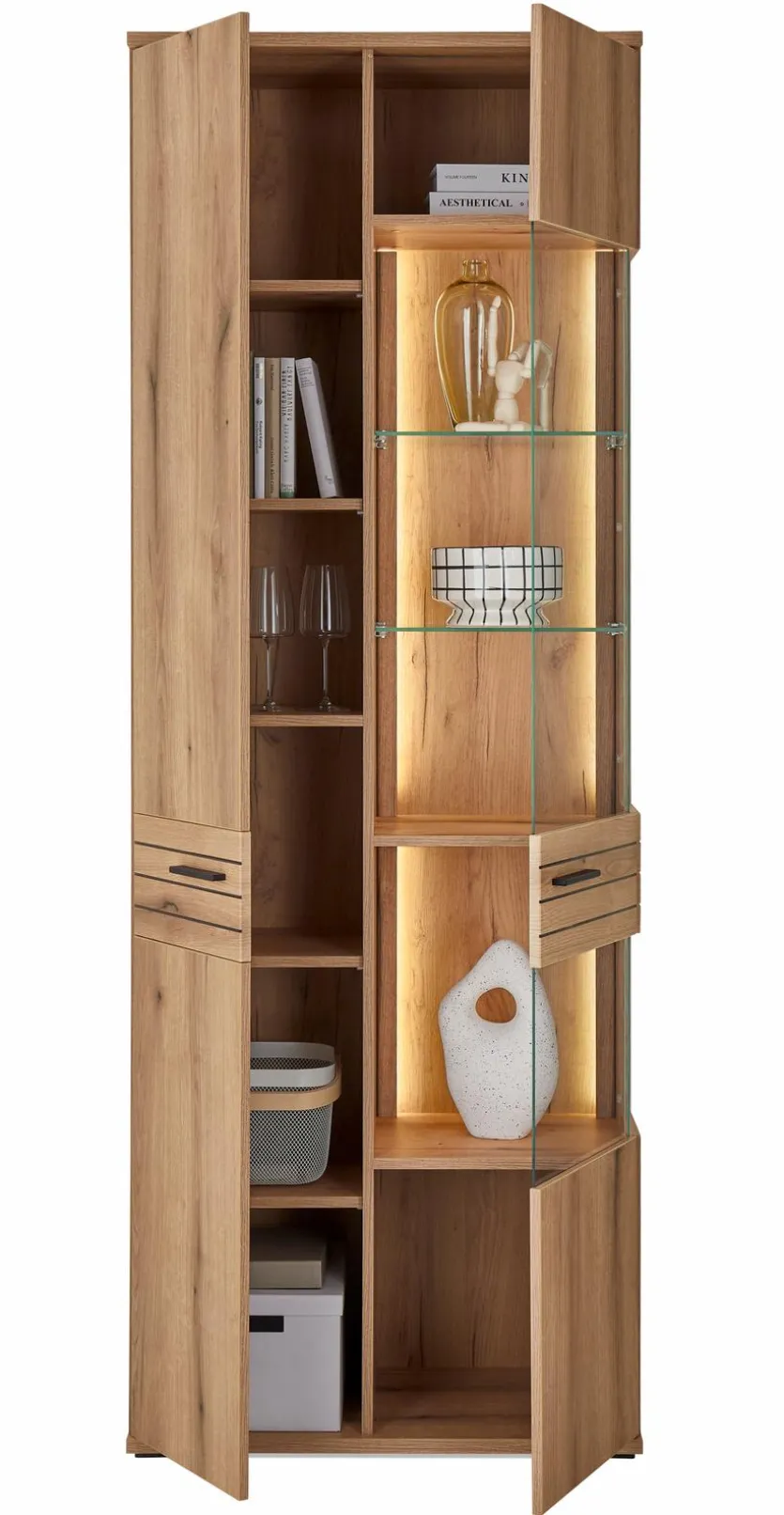 - Mit 2 Türen, 1 Türe davon mit 2 Glasausschnitten, 7 Einlegeböden
