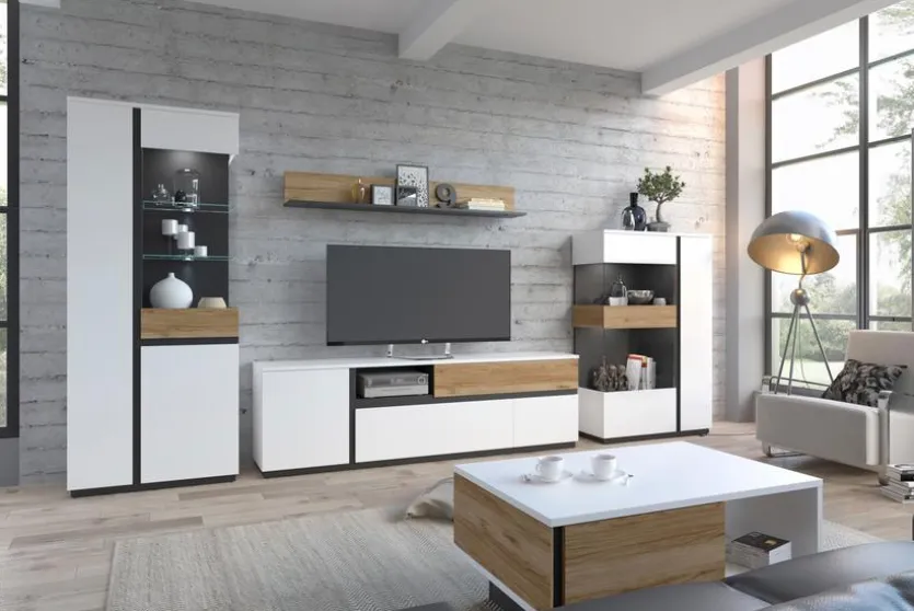 - Aus Holzwerkstoff (Spanplatte) mit kratzfester Melaminharzfolie in Eiche Catania, Ablageboden aus Holzwerkstoff (Spanplatte) mit kratzfester Melaminharzfolie in Schwarz Matt