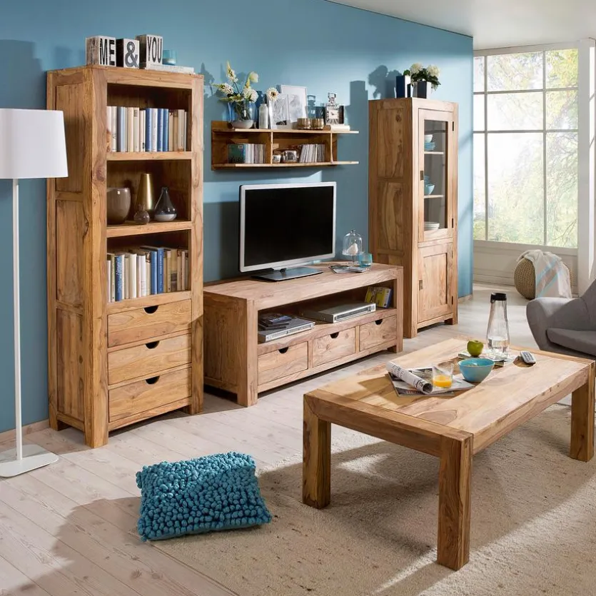 Eine Wandgarderobe oder ein kleines Wandregal aus Holz kann eine schöne Ergänzung zu einem rustikalen Massivholzschrank darstellen. Das Wandregal Yoga im wunderbar ursprünglichen Design besteht aus Sheesham. Die untere Ablage ist bei diesem Modell in drei Fächer unterteilt. Bestückt werden kann das Wandregal Yoga zum Beispiel mit kleinen Skulpturen, Vasen oder Büchern.