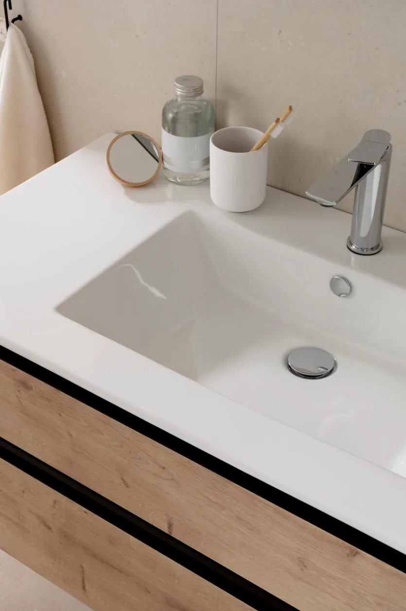- Bestehend aus Waschtischunterschrank mit 2 Metallschubkästen mit Einzugsdämpfung, Keramik-Waschtisch in Weiß mit integriertem Überlauf