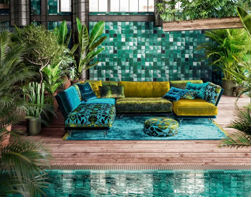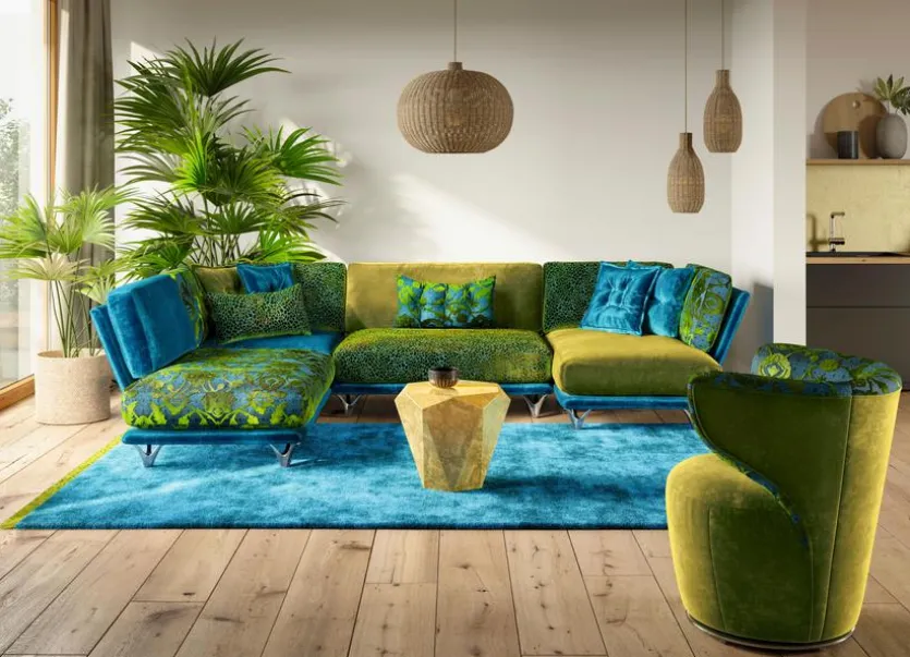 - Bezug aus glänzendem Samtstoff (619426) in enzianblau, Velourstoff (673832) in arabesk türkis, Velourstoff (673932) in boa türkis, Velourstoff (668438) in midsummer oliv, Füße aus Aluminium poliert (26 = Lilie)