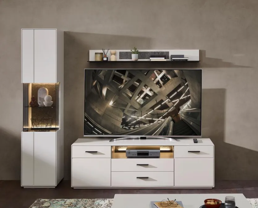 - Wohnwand besteht aus Vitrine, TV-Unterteil und Wandboard
