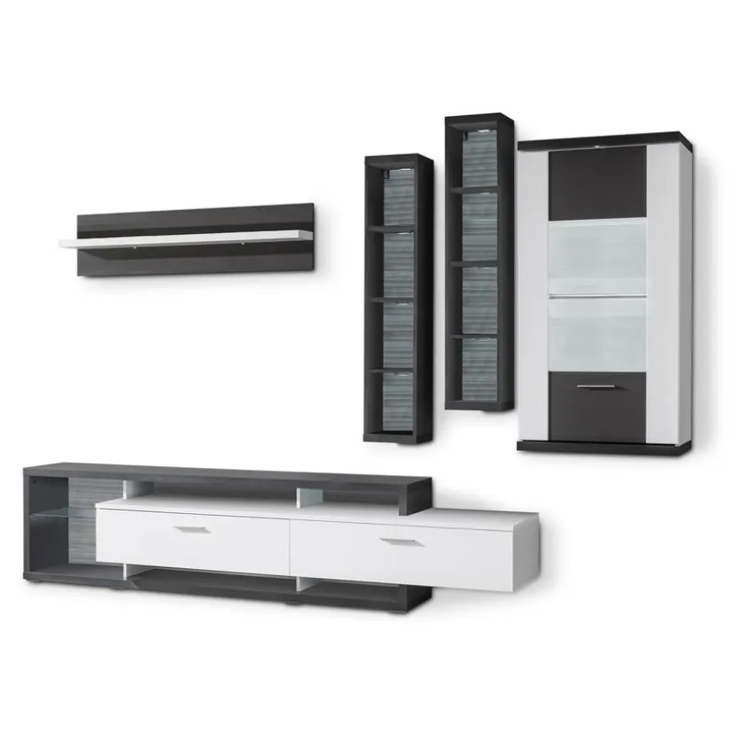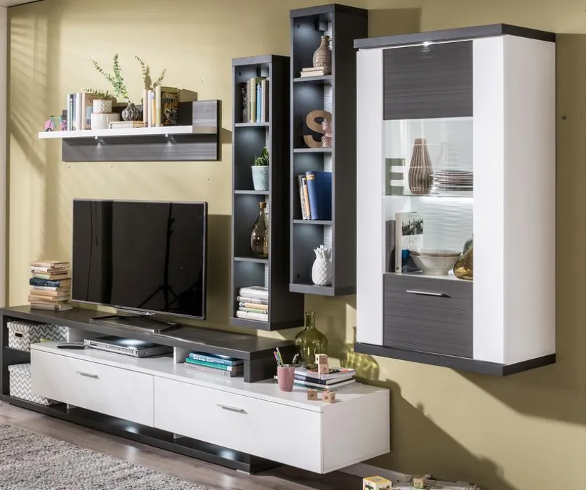 - Wohnwand aus TV-Lowboard, Wandboard, Vitrinen und Hängevitrine