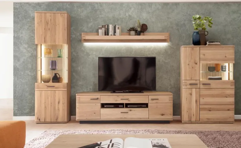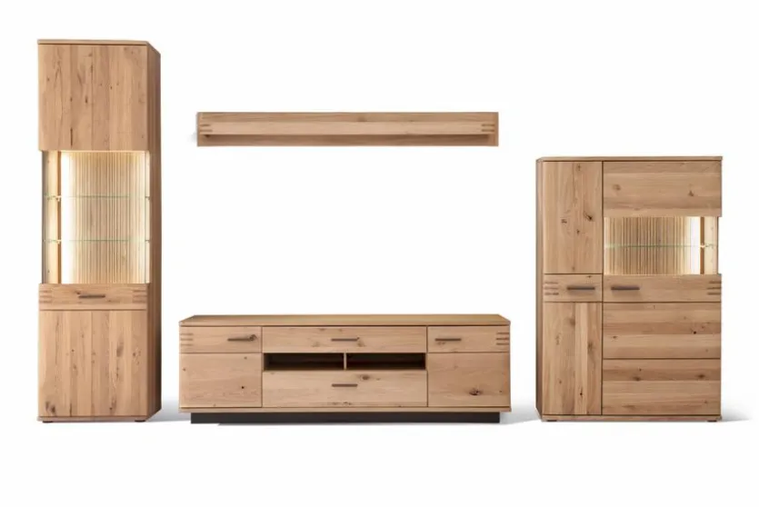 Die Wohnwand Salvador begeistert durch einen tollen Naturholz-Charme. Mit den geradlinigen Formen und den Glas-Akzenten ist das Möbelset sehr dekorativ und bereichert bestimmt auch Ihr Interieur. Darüber hinaus bietet die Wohnwand Salvador reichlich praktischen Stauraum, um verschiedene Gegenstände gut geordnet aufzubewahren oder stilgerecht zu präsentieren.