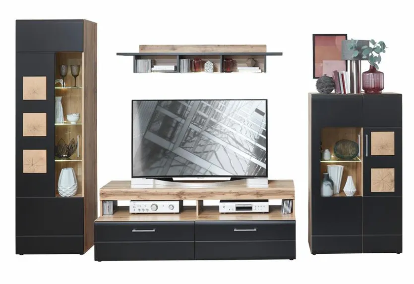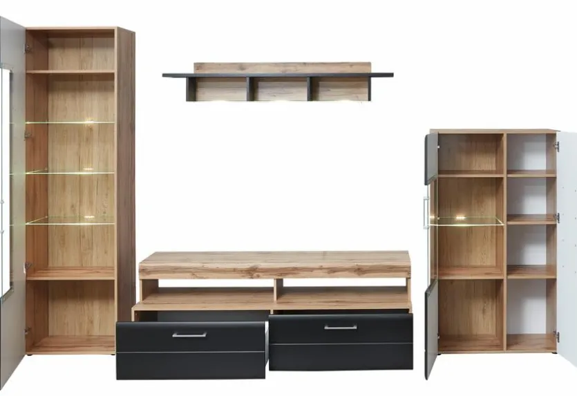 - Bestehend aus: 1 TV-Lowboard, 1 Standvitrine, 1 Highboard, 1 Wandboard