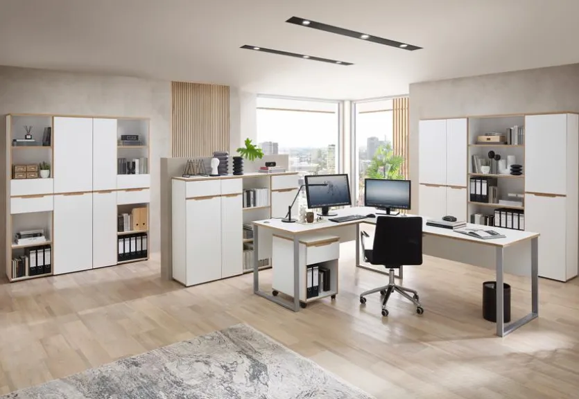 - Front und Korpus aus Holzwerkstoff (MDF) mit Dekorfolie in weiß supermatt, Absetzung in Eiche Artisan