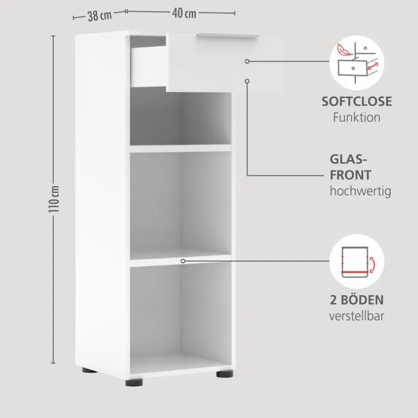 - Korpus aus Holzwerkstoff (Spanplatte) mit kratzfester Melaminharzfolie in weiß, Front in weiß