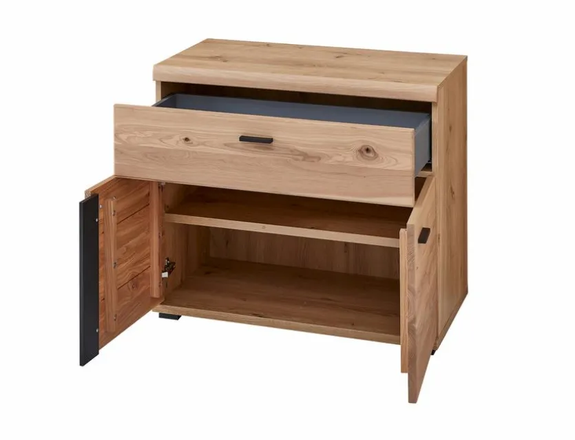 - Front aus Massivholz in Altesche massiv gebürstet, Korpus aus Holzwerkstoff (Spanplatte) mit hochwertiger Dekorfolie in Old Artisan Eiche, Absetzung in schwarz matt