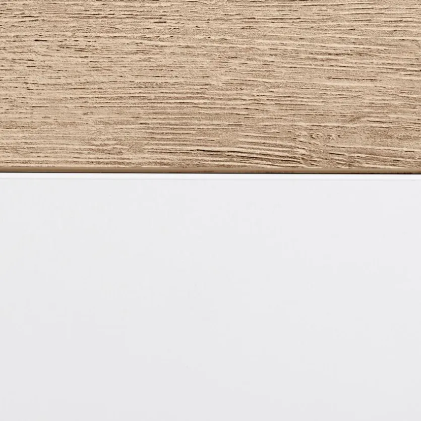 - Aus Spanplatte mit kratzfester Melaminharzfolie in Kreideweiß, Gitterbettseiten aus massiver Buche in weiß lackiert, Absetzung in Eiche Nebraska
