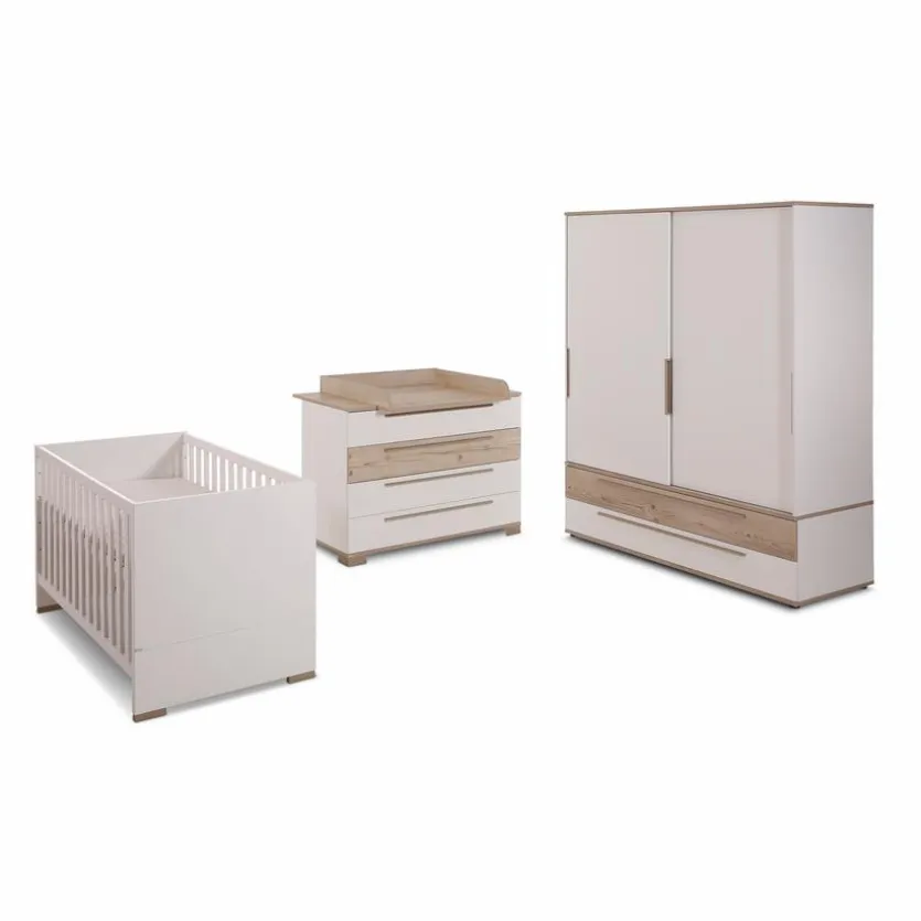 - Set besteht aus Babybett 70 x 140 cm, Schrank BHT 164 x 207 x 62 cm, Wickelkommode BHT 127 x 91 x 56 cm und Wickelaufsatz BHT 127 x 13 x 78 cm
