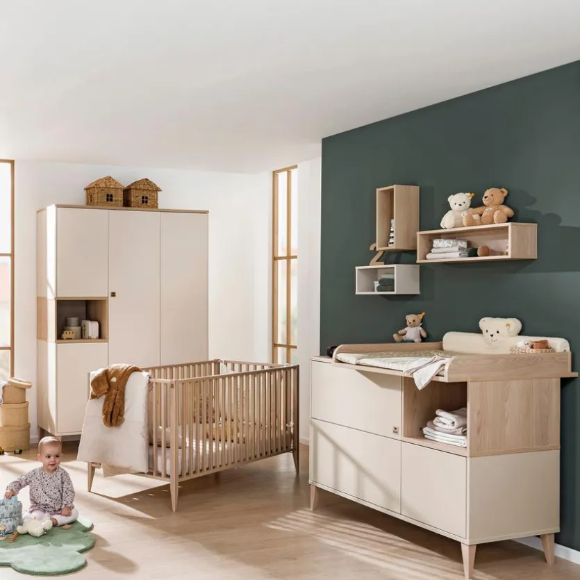 - Aus Spanplatte mit kratzfester Melaminharzfolie in Cashmere-Beige, Deckplatten und Absetzung von Kommode, Schrank und Wickelaufsatz aus Spanplatte mit kratzfester Melaminharfolie in Skandinavian Wood, Bett und Füße aus Massivholz in Buche
