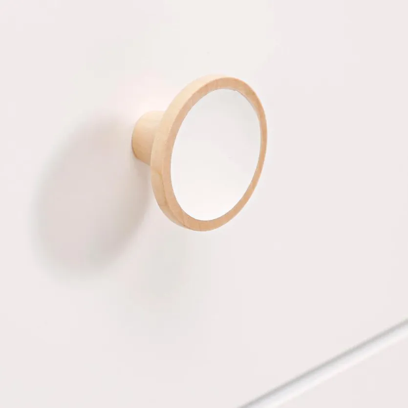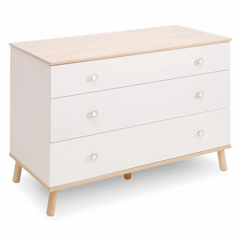 - Aus Spanplatte mit kratzfester Melaminharzfolie in Kreideweiß, Füße, Deckplatte und Absetzungen aus massiver Birke