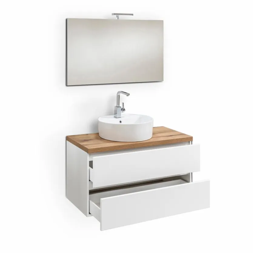 - Waschbeckenunterschrank hängend mit 2 Schubladen mit Dämpfung inkl. Ablageplatte aus Holzwerkstoff (Spanplatte) in Eiche Natur