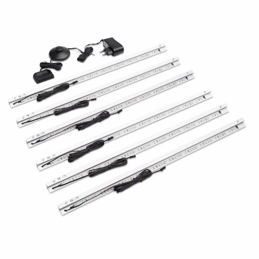 - Artikel beinhaltet Glasbodenbeleuchtung, 6er Set, Kaltlicht, 1 Trafo und 1 Verlängerungskabel mit Fußschalter