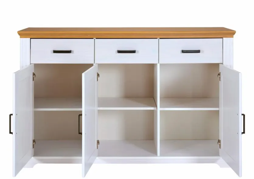 Hochwertiges Design im beliebten Landhausstil zeichnet das Buffet Malnuno aus dem Hause Inter Link aus. Dieser großzügige Buffetschrank bietet hinter blickdichten Türen, in offenen Fächern und geräumigen Schubladen viel Platz, in dem Sie Geschirr, Gläser und andere Haushaltsutensilien verwahren können. Mit seinem klassischen Look bezaubert das Buffet Malnuno in der Küche oder im Ess- oder Wohnzimmer und wertet Ihr Ambiente durch Stil und Ordnung auf.