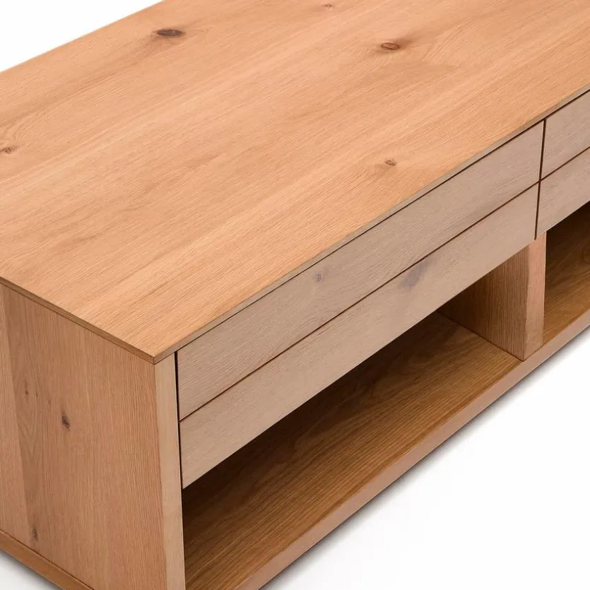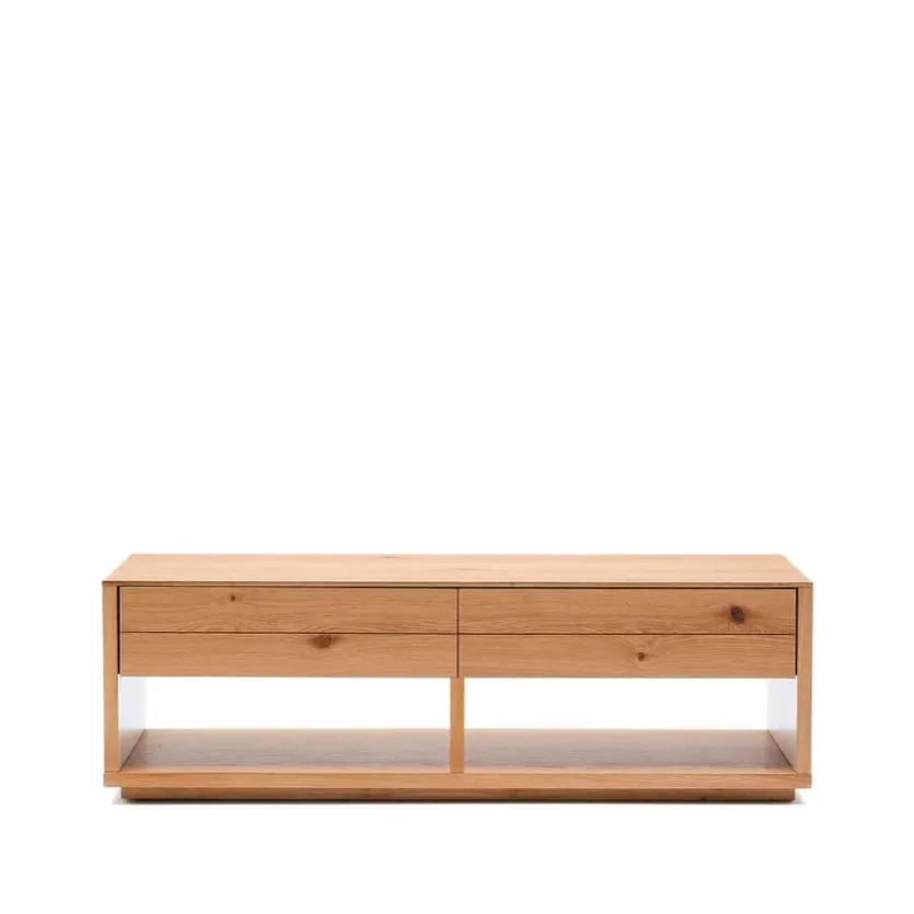 Der Couchtisch Alguema von Kave Home fasziniert mit einem zeitgemäßen Mix aus geradliniger, minimalistischer Form und natürlicher Ausstrahlung. Dieser Wohnzimmertisch wirkt vor jedem Sofa freundlich und warm. Außerdem hält der Couchtisch Alguema neben der Ablagefläche auf der Platte nützlichen Stauraum in seinen Schubkästen und offenen Fächern bereit.
