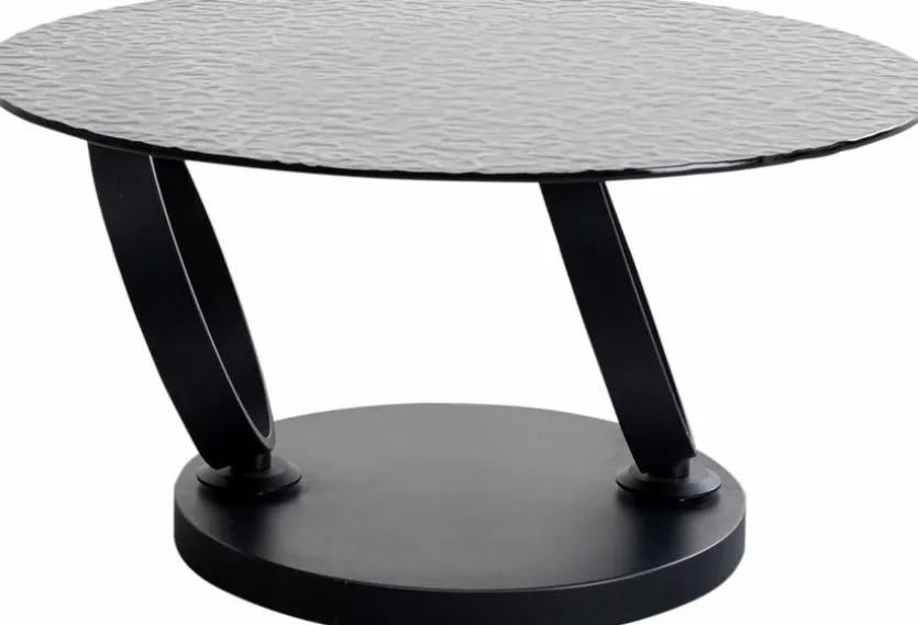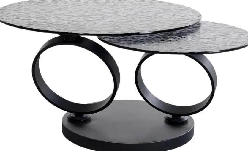 Der aparte Couchtisch Beverly 87650 von KARE DESIGN überzeugt mit Design und Raffinesse. Zwei runde Glastischplatten mit Reliefstruktur und passenden ringförmigen Untergestellen definieren diesen außergewöhnlichen Wohnzimmertisch. Die größere Tischplatte kann mithilfe ihrer Drehfunktion ganz nach außen oder über die kleinere gebracht werden. So wird sowohl die Tischform als auch die Größe seiner Oberfläche verwandelt, wodurch der Couchtisch Beverly 87650 zum skulpturalen Designobjekt avanciert.