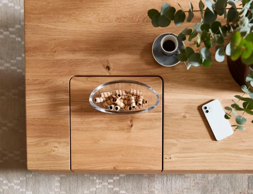 Massive, soft gebürstete Wildeiche verleiht dem Couchtisch WM2250 der Marke Wöstmann ein geschmackvolles Erscheinungsbild. Gegen die Wärme vermittelnde Platte dieses Wohnzimmertisches setzt das klar strukturierte Metallgestell einen attraktiven optischen Kontrast. Mit diesem Look ist der Couchtisch WM2250 ohne Zweifel eine stylische Ergänzung für Einrichtungen unterschiedlichster Art.