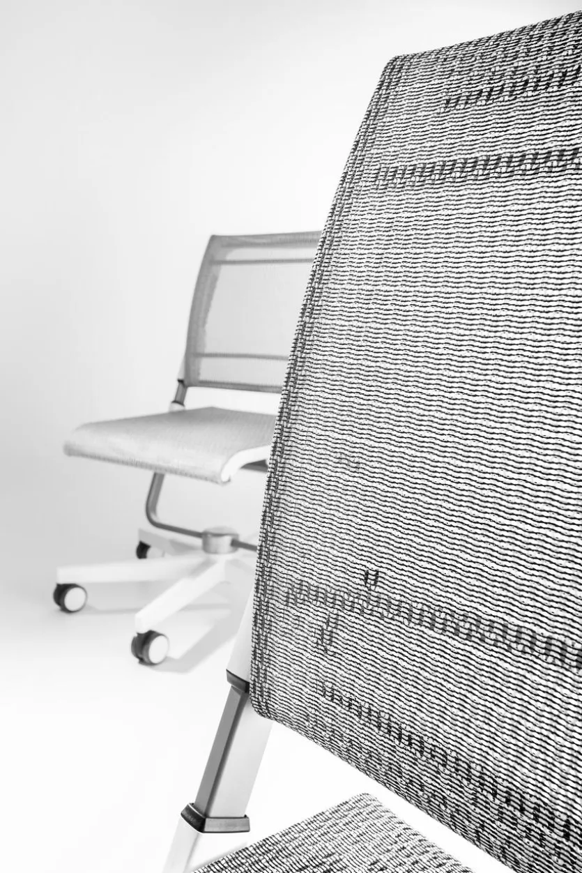 - Stuhl mit silberfarbigem Netzbezug. Gestell aus Stahl