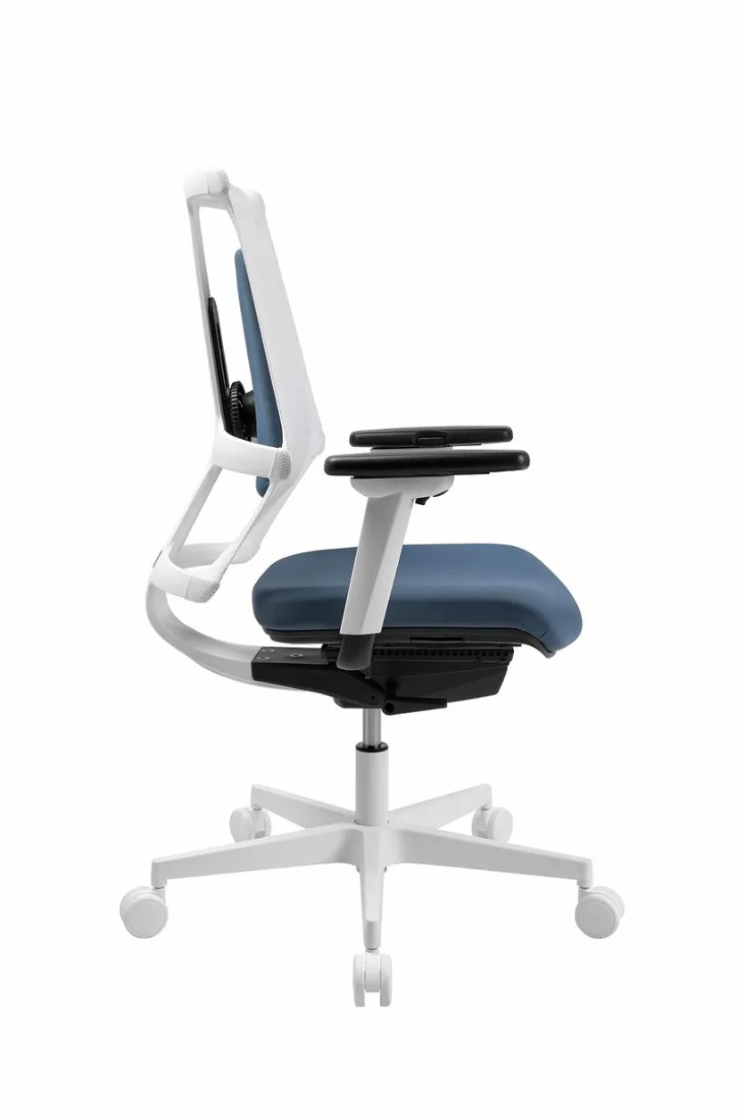 - Rückenlehne mit atmungsaktivem Netzbezug in weiß, Sitzbezug aus Stoff in blau, Fußkreuz aus Kunststoff in weiß