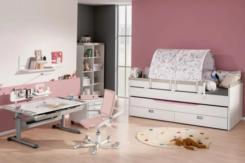 - Atmungsaktiver Bezug aus Stoff in Rosé, Keine störenden Schrauben dank Thermo-Bespannungstechnik