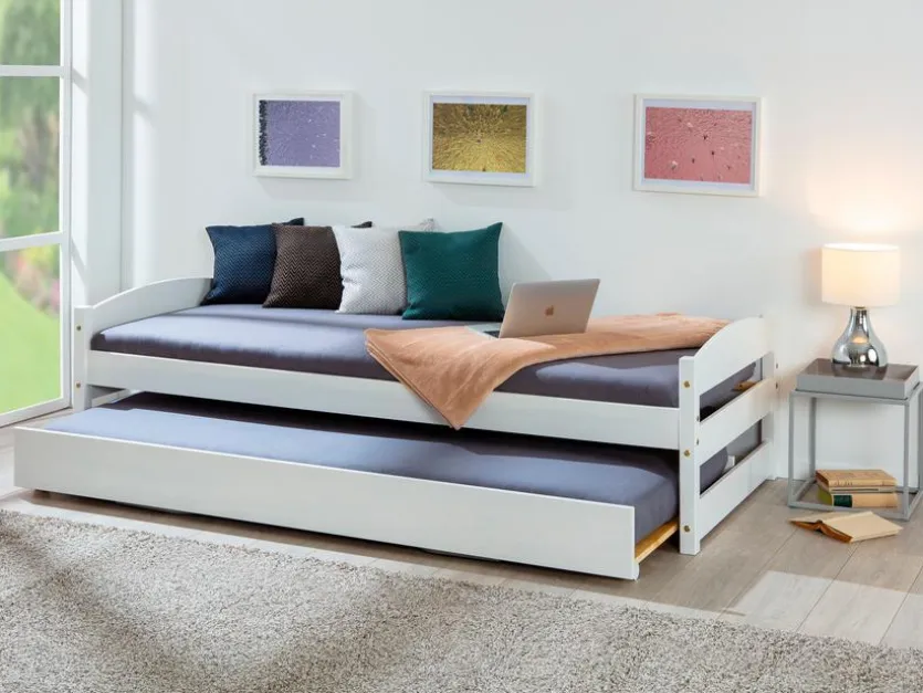- Mit ausziehbarem Bett inkl. Metallfüßen, beide Betten inkl. Auflageleisten für die Matratze; kein zusätzlicher Lattenrost notwendig