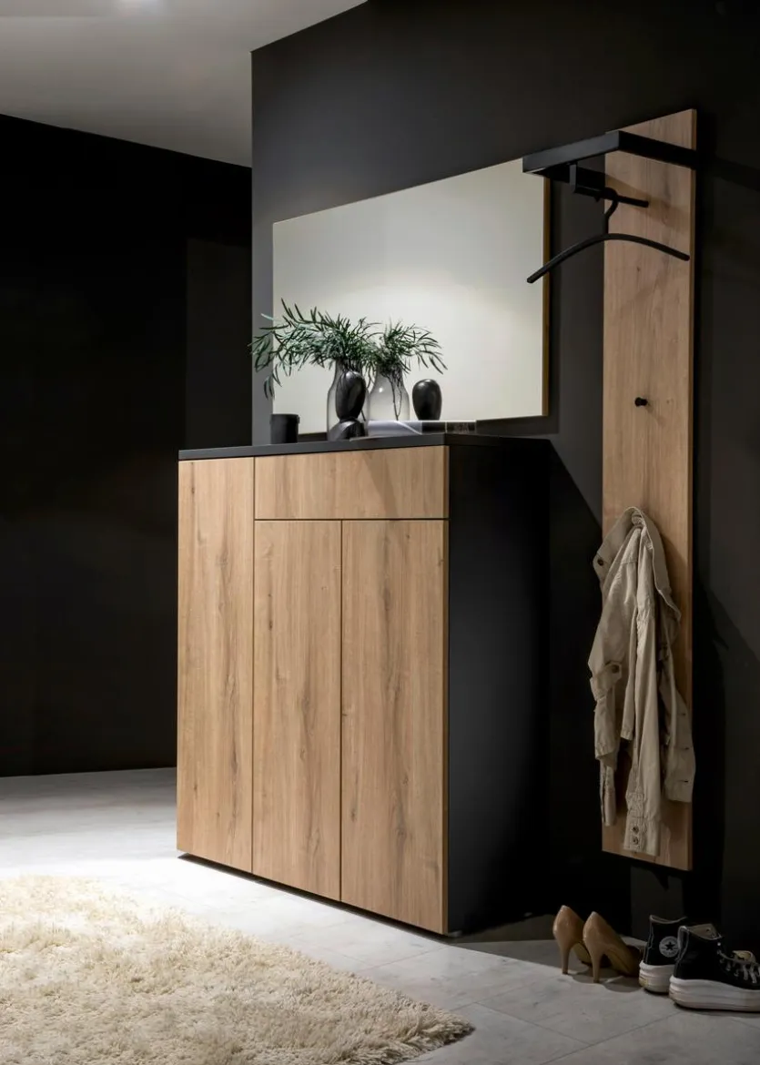 - Bestehend aus: Kommode, Spiegel und Garderobenpaneel