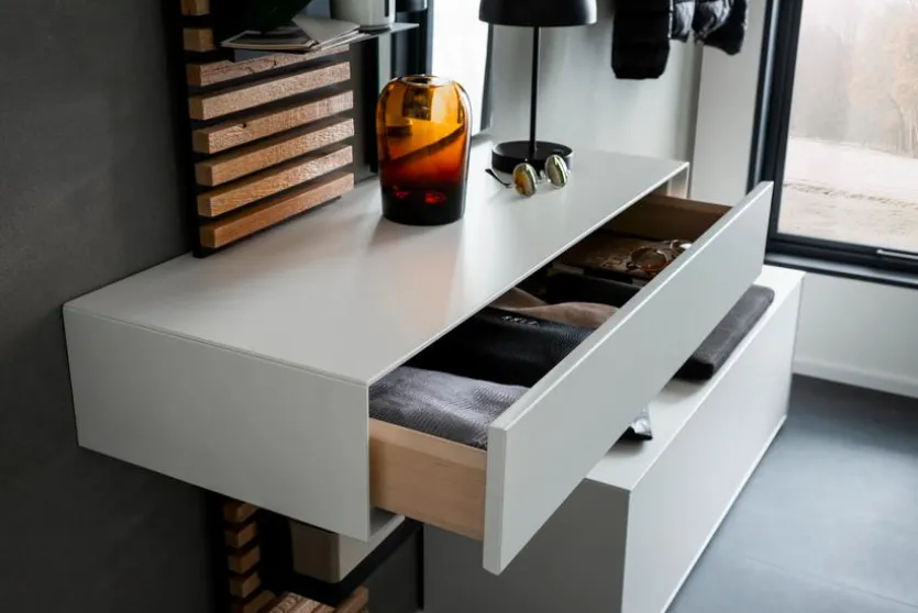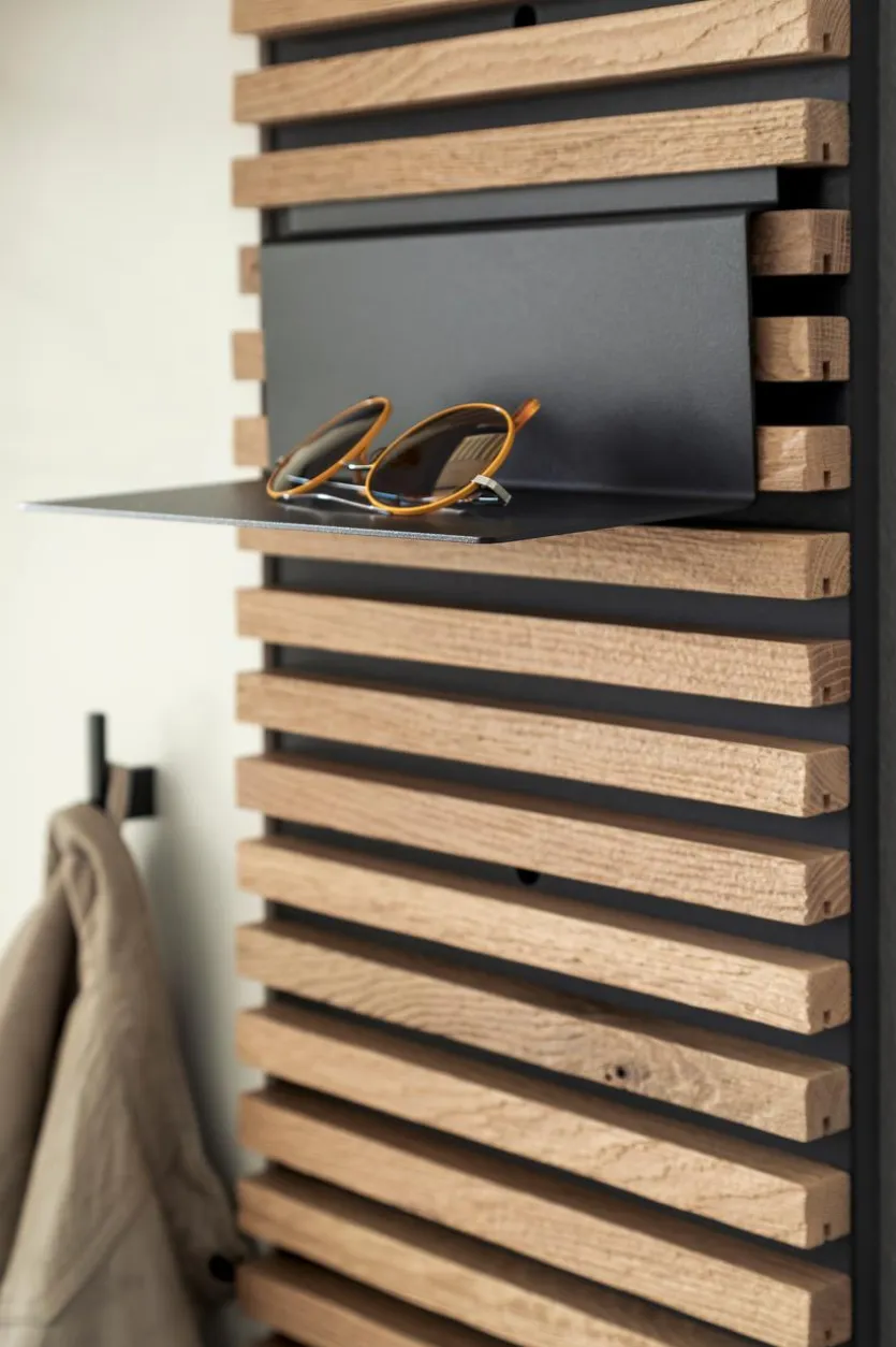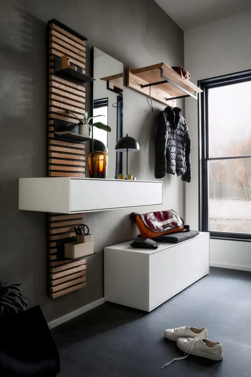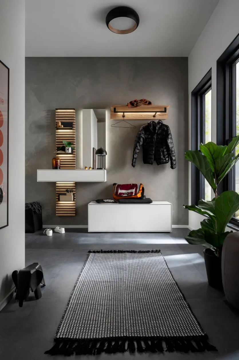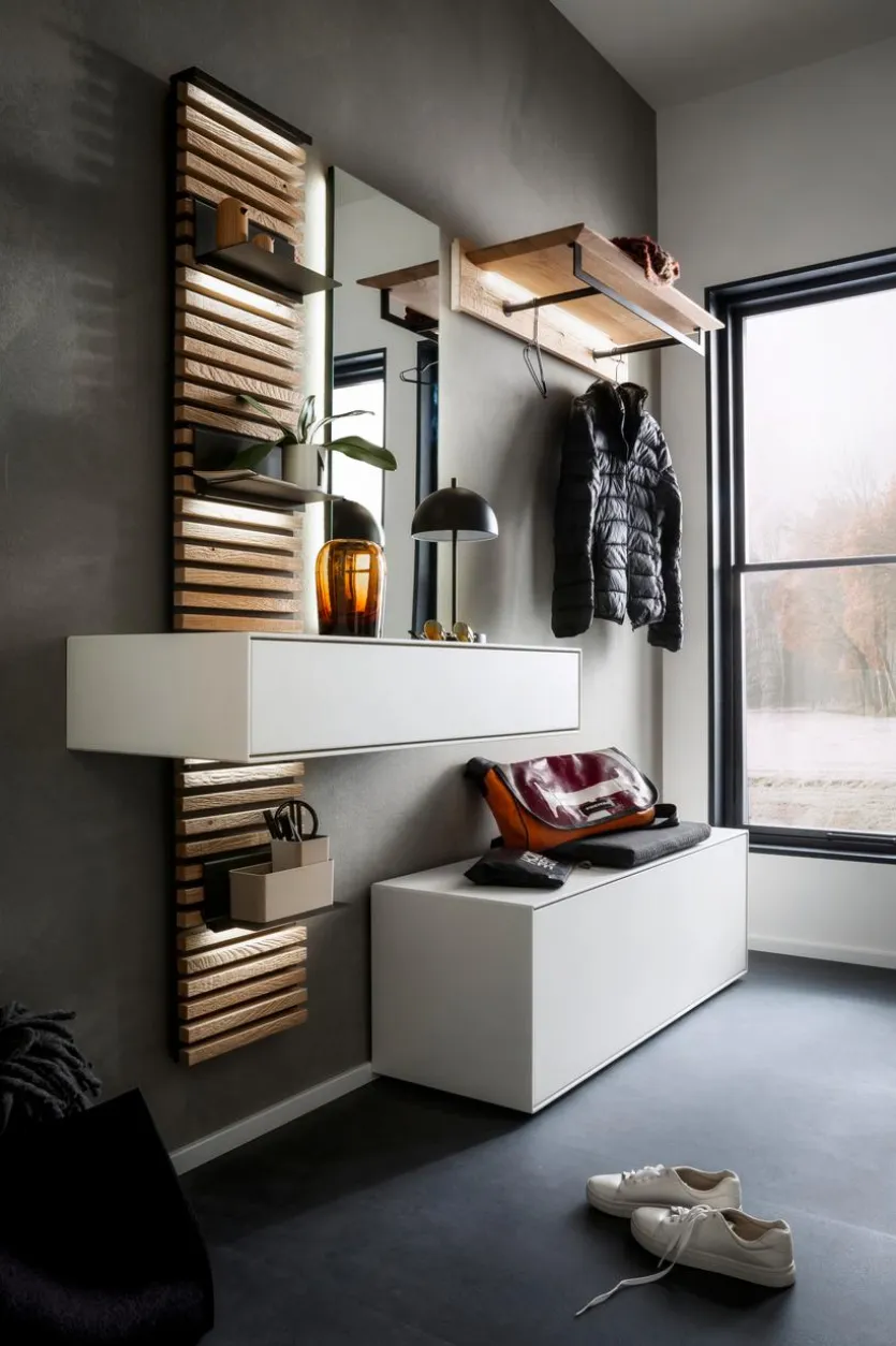 - Bestehend aus: Regalelement, Spiegel, Garderobenbank, Wandgarderobe, Paneelbeleuchtung, Bodenbeleuchtung, Spiegelbeleuchtung und Sitzkissen