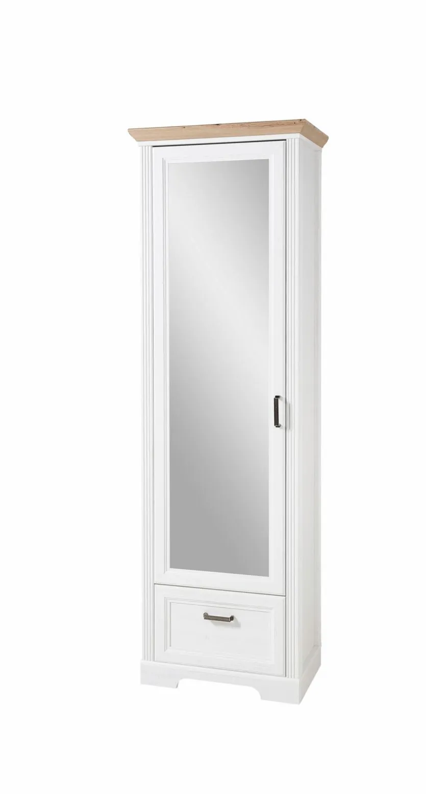 Eine Spiegeltüre macht den Garderobenschrank Jasmin von Innostyle zu einem Möbel, das schön aussieht und zudem noch praktisch ist. Der Dielenschrank wartet mit einem Kranzprofil auf, das dank seiner farblichen Absetzung schön zur Geltung gebracht wird. Elegante Profilierungen bringen beim Garderobenschrank Jasmin aus dem Hause Innostyle weitere dekorative Akzente ins Spiel.