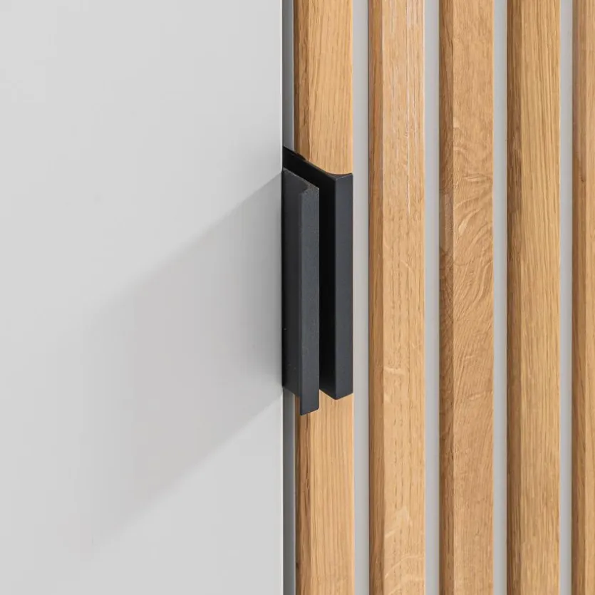 Der Garderobenschrank Madrid bietet mit seiner geschlossenen matten Seite und den Holzpaneelen auf der anderen Seite einzigartige Vielseitigkeit. Der robuste Metallstandrahmen des Dielenschranks sorgt für Stabilität und modernen Charme. Organisieren Sie Ihre Kleidung stilvoll und effizient mit diesem praktischen und ästhetischen Garderobenschrank Madrid.