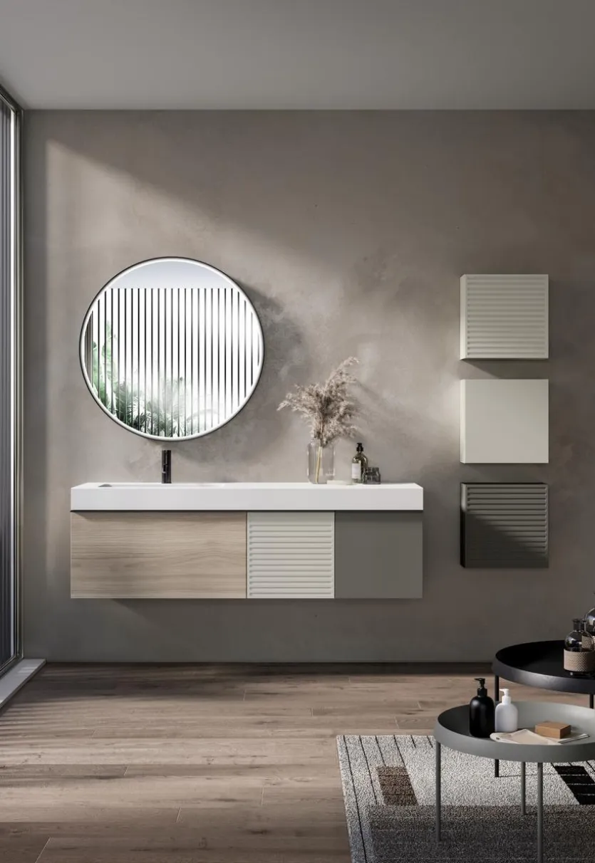 - Hängeschrank mit 1 Türe und 1 Einlegeboden mit der Fronttype Stripes in pastellgrau matt lackiert