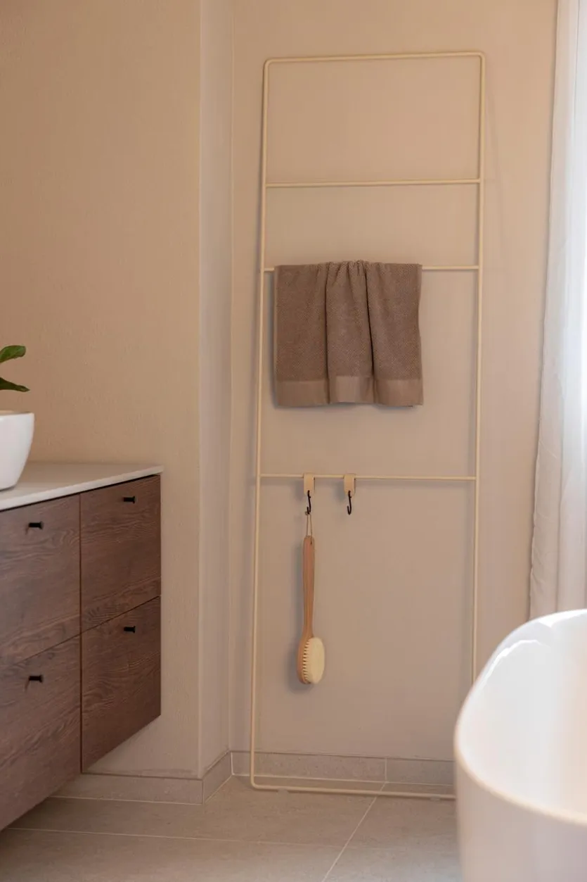 Wer gerne außergewöhnliches Design mit funktionalem Nutzen kombiniert, wird die Handtuchleiter Estina von Metallbude lieben. Die Dekoleiter überzeugt durch ihren modernen, minimalistischen Look aus schlichten Metallleisten. Platzsparend und ästhetisch nimmt die Handtuchleiter Estina Badetücher, Accessoires oder Kleidungsstücke auf und sorgt damit für Ordnung auch im kleinen Badezimmer.