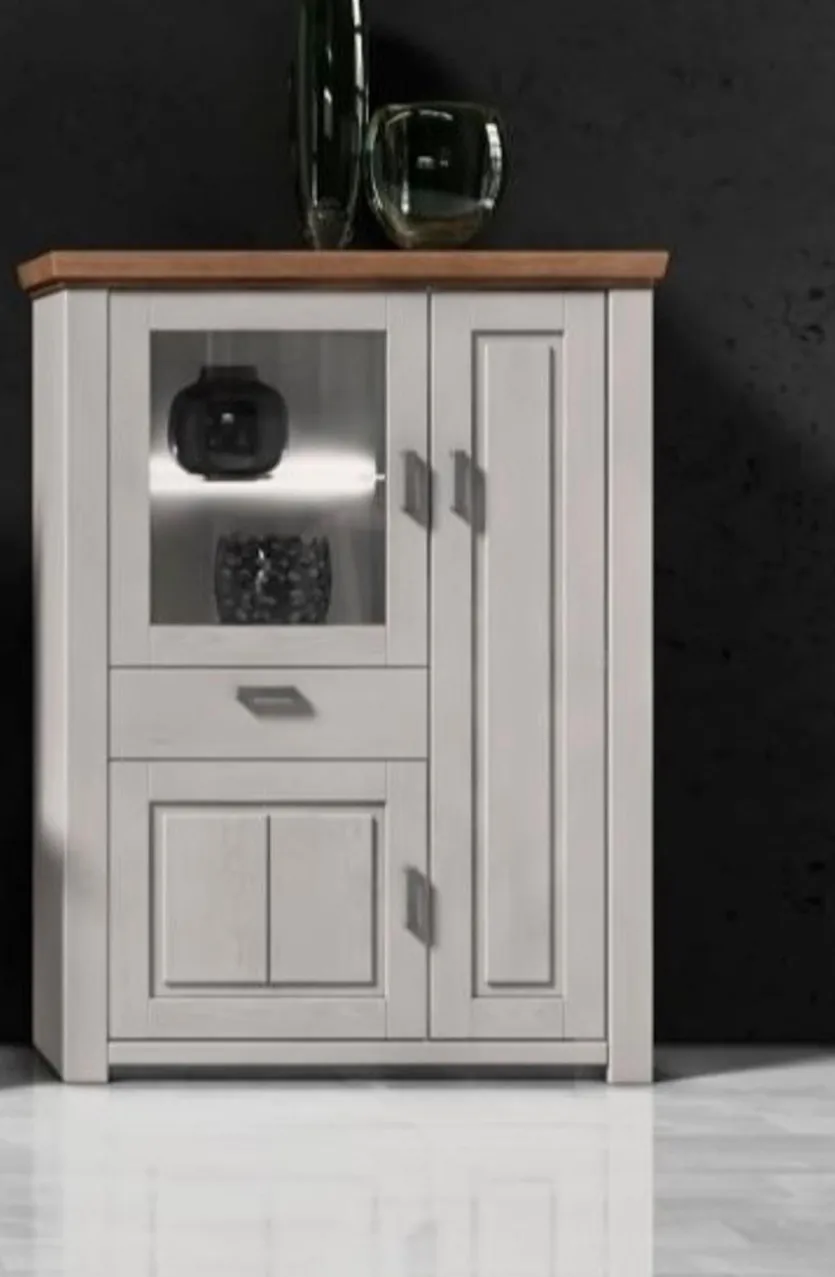 - Highboard besteht aus: 1 Glastür links oben, 1 Holztür hoch rechts, 1 Holztür klein links unten, 1 Schubkasten links, 1 Glasboden links, 1 Konstruktionsboden links, 3 Holzboden rechts