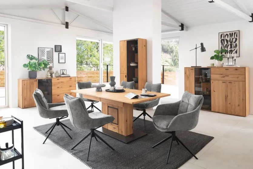 - Front aus Ast/Balkeneiche massiv, durchgehende Lamelle in Wildeiche geölt, Korpus aus Ast/Balkeneiche furniert in Wildeiche geölt