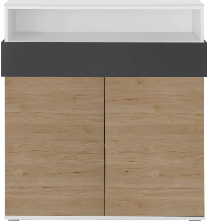 - Korpus aus Holzwerkstoff (Spanplatte) mit kratzfester Melaminharzfolie in weiß, Fronten aus Holzwerkstoff (Spanplatte) mit kratzfester Melaminharzfolie in Hickory, Absetzung aus Holzwerkstoff (Spanplatte) mit kratzfester Melaminharzfolie in anthrazit