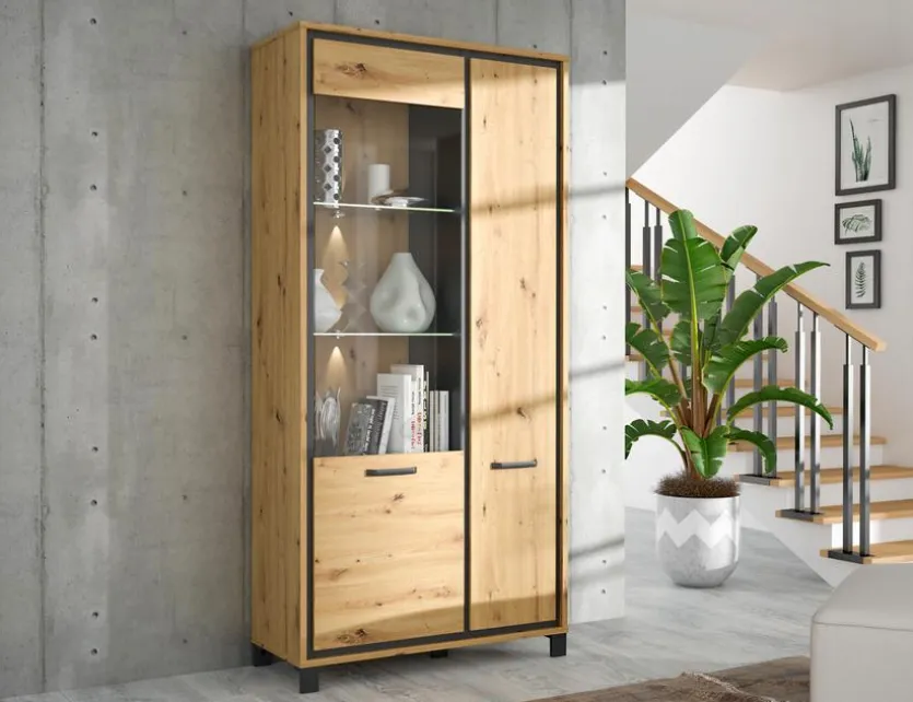 - Aus Holzwerkstoff (Spanplatte) mit hochwertiger Dekorfolie in Artisan Eiche, Absetzungen in Eiche schwarz