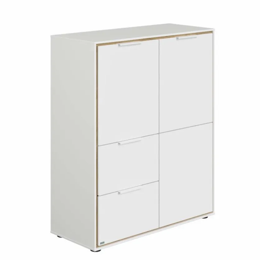 - Aus Holzwerkstoff (Spanplatte) mit kratzfester Melaminharzfolie in Kreideweiß, Innenkorpus und Einlegeböden aus Holzwerkstoff (Spanplatte) mit kratzfester Melaminharzfolie in Eiche-Montana-Nachbildung