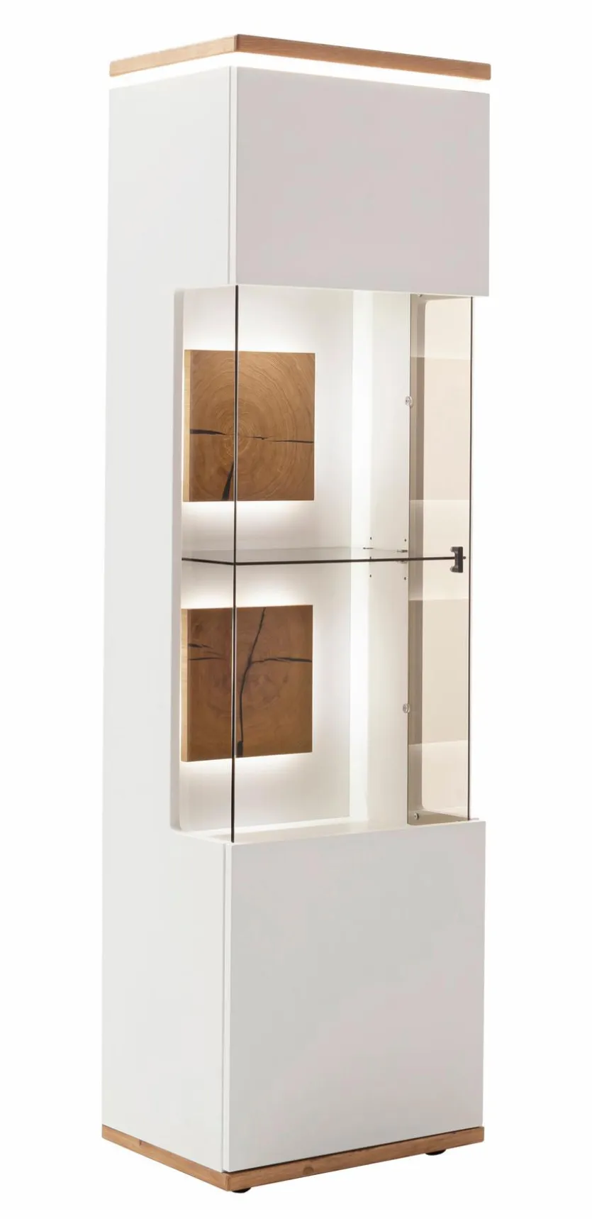 - Korpus und Front aus Holzwerkstoff (Spanplatte) mit Lack in Soft White, Absetzung aus Holzwerkstoff (Spanplatte) Ast/Balkeneiche furniert in Wildeiche geölt