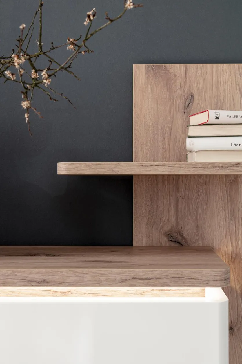 - Korpus aus Holzwerkstoff (Spanplatte) mit kratzfester Melaminharzfolie in Soft White Melamin Nachbildung, Front aus Holzwerkstoff (MDF) in Soft White Nachbildung lackiert, Absetzung aus Holzwerkstoff (Spanplatte) in Viking Oak Melamin Nachbildung