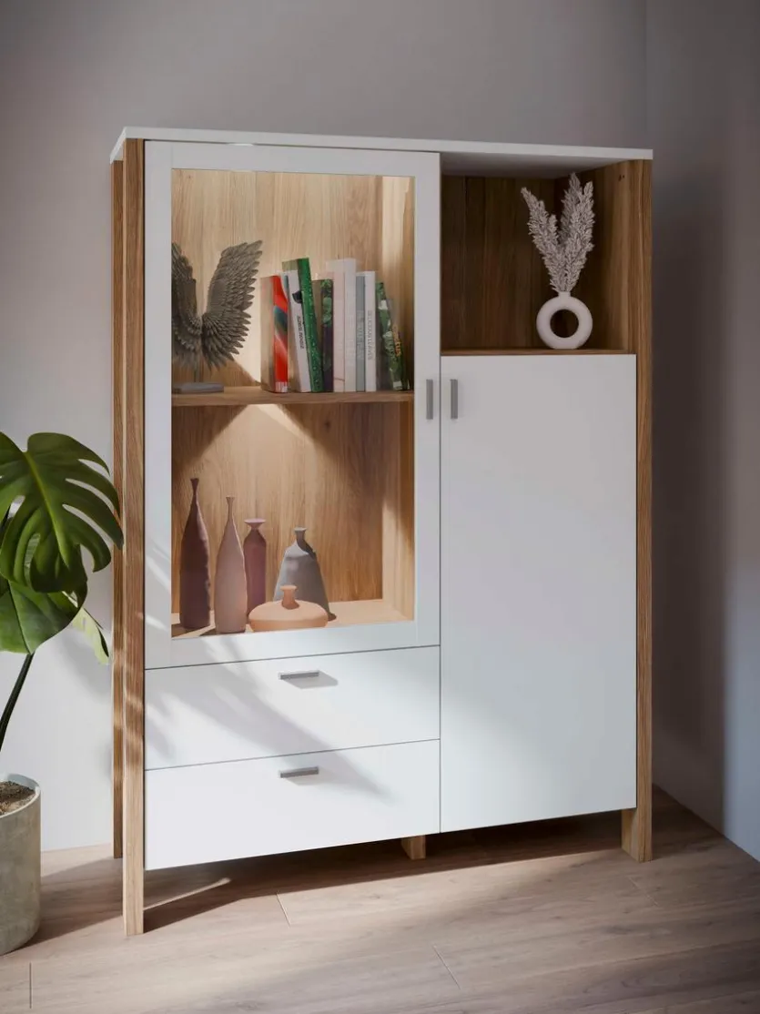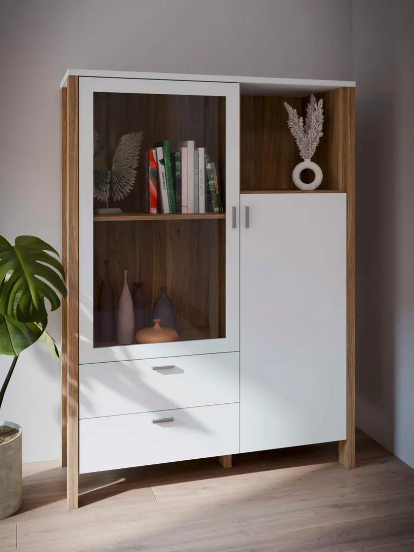 - Mit 2 Türen (1 Türe mit Glaseinsatz), 2 Schubkästen und 1 offenen Fach